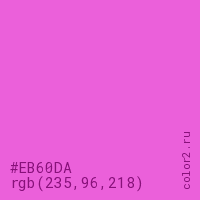 Цвет #EB60DA в цветовой модели RGB обозначается тремя октетами (235, 96, 218) в десятичном формате и #EB60DA в шестнадцатиричном (hex) формате, которые являются интенсивностью красного 235 (hex EB), интенсивность зелёного 96 (hex 60) и интенсивность синего 218 (hex DA).