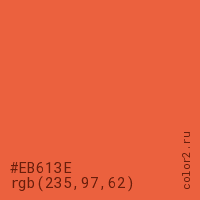 Цвет #EB613E в цветовой модели RGB обозначается тремя октетами (235, 97, 62) в десятичном формате и #EB613E в шестнадцатиричном (hex) формате, которые являются интенсивностью красного 235 (hex EB), интенсивность зелёного 97 (hex 61) и интенсивность синего 62 (hex 3E).