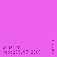 Цвет #EB61EC в цветовой модели RGB обозначается тремя октетами (235, 97, 236) в десятичном формате и #EB61EC в шестнадцатиричном (hex) формате, которые являются интенсивностью красного 235 (hex EB), интенсивность зелёного 97 (hex 61) и интенсивность синего 236 (hex EC).