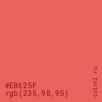 Цвет #EB625F в цветовой модели RGB обозначается тремя октетами (235, 98, 95) в десятичном формате и #EB625F в шестнадцатиричном (hex) формате, которые являются интенсивностью красного 235 (hex EB), интенсивность зелёного 98 (hex 62) и интенсивность синего 95 (hex 5F).