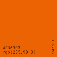 Цвет #EB6303 в цветовой модели RGB обозначается тремя октетами (235, 99, 3) в десятичном формате и #EB6303 в шестнадцатиричном (hex) формате, которые являются интенсивностью красного 235 (hex EB), интенсивность зелёного 99 (hex 63) и интенсивность синего 3 (hex 03).