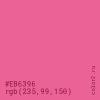 Цвет #EB6396 в цветовой модели RGB обозначается тремя октетами (235, 99, 150) в десятичном формате и #EB6396 в шестнадцатиричном (hex) формате, которые являются интенсивностью красного 235 (hex EB), интенсивность зелёного 99 (hex 63) и интенсивность синего 150 (hex 96).