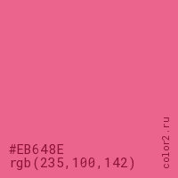 Цвет #EB648E в цветовой модели RGB обозначается тремя октетами (235, 100, 142) в десятичном формате и #EB648E в шестнадцатиричном (hex) формате, которые являются интенсивностью красного 235 (hex EB), интенсивность зелёного 100 (hex 64) и интенсивность синего 142 (hex 8E).