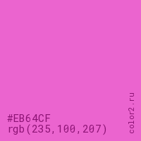 Цвет #EB64CF в цветовой модели RGB обозначается тремя октетами (235, 100, 207) в десятичном формате и #EB64CF в шестнадцатиричном (hex) формате, которые являются интенсивностью красного 235 (hex EB), интенсивность зелёного 100 (hex 64) и интенсивность синего 207 (hex CF).
