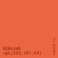 Цвет #EB6540 в цветовой модели RGB обозначается тремя октетами (235, 101, 64) в десятичном формате и #EB6540 в шестнадцатиричном (hex) формате, которые являются интенсивностью красного 235 (hex EB), интенсивность зелёного 101 (hex 65) и интенсивность синего 64 (hex 40).