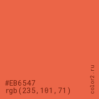 Цвет #EB6547 в цветовой модели RGB обозначается тремя октетами (235, 101, 71) в десятичном формате и #EB6547 в шестнадцатиричном (hex) формате, которые являются интенсивностью красного 235 (hex EB), интенсивность зелёного 101 (hex 65) и интенсивность синего 71 (hex 47).