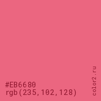 Цвет #EB6680 в цветовой модели RGB обозначается тремя октетами (235, 102, 128) в десятичном формате и #EB6680 в шестнадцатиричном (hex) формате, которые являются интенсивностью красного 235 (hex EB), интенсивность зелёного 102 (hex 66) и интенсивность синего 128 (hex 80).