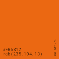 Цвет #EB6812 в цветовой модели RGB обозначается тремя октетами (235, 104, 18) в десятичном формате и #EB6812 в шестнадцатиричном (hex) формате, которые являются интенсивностью красного 235 (hex EB), интенсивность зелёного 104 (hex 68) и интенсивность синего 18 (hex 12).