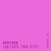 Цвет #EB68DB в цветовой модели RGB обозначается тремя октетами (235, 104, 219) в десятичном формате и #EB68DB в шестнадцатиричном (hex) формате, которые являются интенсивностью красного 235 (hex EB), интенсивность зелёного 104 (hex 68) и интенсивность синего 219 (hex DB).