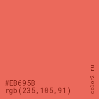Цвет #EB695B в цветовой модели RGB обозначается тремя октетами (235, 105, 91) в десятичном формате и #EB695B в шестнадцатиричном (hex) формате, которые являются интенсивностью красного 235 (hex EB), интенсивность зелёного 105 (hex 69) и интенсивность синего 91 (hex 5B).