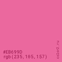 Цвет #EB699D в цветовой модели RGB обозначается тремя октетами (235, 105, 157) в десятичном формате и #EB699D в шестнадцатиричном (hex) формате, которые являются интенсивностью красного 235 (hex EB), интенсивность зелёного 105 (hex 69) и интенсивность синего 157 (hex 9D).