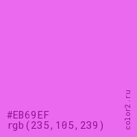 Цвет #EB69EF в цветовой модели RGB обозначается тремя октетами (235, 105, 239) в десятичном формате и #EB69EF в шестнадцатиричном (hex) формате, которые являются интенсивностью красного 235 (hex EB), интенсивность зелёного 105 (hex 69) и интенсивность синего 239 (hex EF).