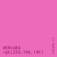 Цвет #EB6ABA в цветовой модели RGB обозначается тремя октетами (235, 106, 186) в десятичном формате и #EB6ABA в шестнадцатиричном (hex) формате, которые являются интенсивностью красного 235 (hex EB), интенсивность зелёного 106 (hex 6A) и интенсивность синего 186 (hex BA).