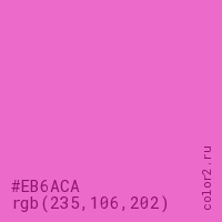 Цвет #EB6ACA в цветовой модели RGB обозначается тремя октетами (235, 106, 202) в десятичном формате и #EB6ACA в шестнадцатиричном (hex) формате, которые являются интенсивностью красного 235 (hex EB), интенсивность зелёного 106 (hex 6A) и интенсивность синего 202 (hex CA).