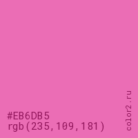 Цвет #EB6DB5 в цветовой модели RGB обозначается тремя октетами (235, 109, 181) в десятичном формате и #EB6DB5 в шестнадцатиричном (hex) формате, которые являются интенсивностью красного 235 (hex EB), интенсивность зелёного 109 (hex 6D) и интенсивность синего 181 (hex B5).