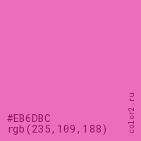 Цвет #EB6DBC в цветовой модели RGB обозначается тремя октетами (235, 109, 188) в десятичном формате и #EB6DBC в шестнадцатиричном (hex) формате, которые являются интенсивностью красного 235 (hex EB), интенсивность зелёного 109 (hex 6D) и интенсивность синего 188 (hex BC).