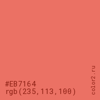 Цвет #EB7164 в цветовой модели RGB обозначается тремя октетами (235, 113, 100) в десятичном формате и #EB7164 в шестнадцатиричном (hex) формате, которые являются интенсивностью красного 235 (hex EB), интенсивность зелёного 113 (hex 71) и интенсивность синего 100 (hex 64).