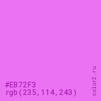 Цвет #EB72F3 в цветовой модели RGB обозначается тремя октетами (235, 114, 243) в десятичном формате и #EB72F3 в шестнадцатиричном (hex) формате, которые являются интенсивностью красного 235 (hex EB), интенсивность зелёного 114 (hex 72) и интенсивность синего 243 (hex F3).
