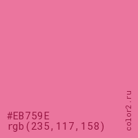 Цвет #EB759E в цветовой модели RGB обозначается тремя октетами (235, 117, 158) в десятичном формате и #EB759E в шестнадцатиричном (hex) формате, которые являются интенсивностью красного 235 (hex EB), интенсивность зелёного 117 (hex 75) и интенсивность синего 158 (hex 9E).