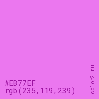 Цвет #EB77EF в цветовой модели RGB обозначается тремя октетами (235, 119, 239) в десятичном формате и #EB77EF в шестнадцатиричном (hex) формате, которые являются интенсивностью красного 235 (hex EB), интенсивность зелёного 119 (hex 77) и интенсивность синего 239 (hex EF).