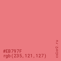 Цвет #EB797F в цветовой модели RGB обозначается тремя октетами (235, 121, 127) в десятичном формате и #EB797F в шестнадцатиричном (hex) формате, которые являются интенсивностью красного 235 (hex EB), интенсивность зелёного 121 (hex 79) и интенсивность синего 127 (hex 7F).