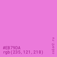 Цвет #EB79DA в цветовой модели RGB обозначается тремя октетами (235, 121, 218) в десятичном формате и #EB79DA в шестнадцатиричном (hex) формате, которые являются интенсивностью красного 235 (hex EB), интенсивность зелёного 121 (hex 79) и интенсивность синего 218 (hex DA).