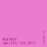 Цвет #EB7BCF в цветовой модели RGB обозначается тремя октетами (235, 123, 207) в десятичном формате и #EB7BCF в шестнадцатиричном (hex) формате, которые являются интенсивностью красного 235 (hex EB), интенсивность зелёного 123 (hex 7B) и интенсивность синего 207 (hex CF).