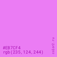 Цвет #EB7CF4 в цветовой модели RGB обозначается тремя октетами (235, 124, 244) в десятичном формате и #EB7CF4 в шестнадцатиричном (hex) формате, которые являются интенсивностью красного 235 (hex EB), интенсивность зелёного 124 (hex 7C) и интенсивность синего 244 (hex F4).