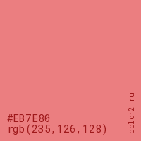 Цвет #EB7E80 в цветовой модели RGB обозначается тремя октетами (235, 126, 128) в десятичном формате и #EB7E80 в шестнадцатиричном (hex) формате, которые являются интенсивностью красного 235 (hex EB), интенсивность зелёного 126 (hex 7E) и интенсивность синего 128 (hex 80).