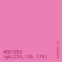 Цвет #EB7EB3 в цветовой модели RGB обозначается тремя октетами (235, 126, 179) в десятичном формате и #EB7EB3 в шестнадцатиричном (hex) формате, которые являются интенсивностью красного 235 (hex EB), интенсивность зелёного 126 (hex 7E) и интенсивность синего 179 (hex B3).