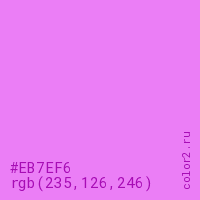Цвет RGB(235, 126, 246) в процентом отношении количества цвета состоит из 92.2% красного (red), 49.4% зелёного (green) и 96.5% синего (blue).