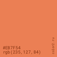 Цвет #EB7F54 в цветовой модели RGB обозначается тремя октетами (235, 127, 84) в десятичном формате и #EB7F54 в шестнадцатиричном (hex) формате, которые являются интенсивностью красного 235 (hex EB), интенсивность зелёного 127 (hex 7F) и интенсивность синего 84 (hex 54).