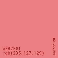 Цвет #EB7F81 в цветовой модели RGB обозначается тремя октетами (235, 127, 129) в десятичном формате и #EB7F81 в шестнадцатиричном (hex) формате, которые являются интенсивностью красного 235 (hex EB), интенсивность зелёного 127 (hex 7F) и интенсивность синего 129 (hex 81).