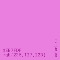 Цвет RGB(235, 127, 223) в процентом отношении количества цвета состоит из 92.2% красного (red), 49.8% зелёного (green) и 87.5% синего (blue).