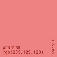 Цвет #EB8180 в цветовой модели RGB обозначается тремя октетами (235, 129, 128) в десятичном формате и #EB8180 в шестнадцатиричном (hex) формате, которые являются интенсивностью красного 235 (hex EB), интенсивность зелёного 129 (hex 81) и интенсивность синего 128 (hex 80).