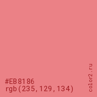 Цвет #EB8186 в цветовой модели RGB обозначается тремя октетами (235, 129, 134) в десятичном формате и #EB8186 в шестнадцатиричном (hex) формате, которые являются интенсивностью красного 235 (hex EB), интенсивность зелёного 129 (hex 81) и интенсивность синего 134 (hex 86).