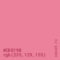 Цвет #EB819B в цветовой модели RGB обозначается тремя октетами (235, 129, 155) в десятичном формате и #EB819B в шестнадцатиричном (hex) формате, которые являются интенсивностью красного 235 (hex EB), интенсивность зелёного 129 (hex 81) и интенсивность синего 155 (hex 9B).