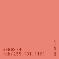 Цвет #EB8374 в цветовой модели RGB обозначается тремя октетами (235, 131, 116) в десятичном формате и #EB8374 в шестнадцатиричном (hex) формате, которые являются интенсивностью красного 235 (hex EB), интенсивность зелёного 131 (hex 83) и интенсивность синего 116 (hex 74).
