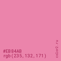 Цвет #EB84AB в цветовой модели RGB обозначается тремя октетами (235, 132, 171) в десятичном формате и #EB84AB в шестнадцатиричном (hex) формате, которые являются интенсивностью красного 235 (hex EB), интенсивность зелёного 132 (hex 84) и интенсивность синего 171 (hex AB).