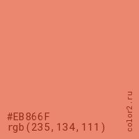 Цвет #EB866F в цветовой модели RGB обозначается тремя октетами (235, 134, 111) в десятичном формате и #EB866F в шестнадцатиричном (hex) формате, которые являются интенсивностью красного 235 (hex EB), интенсивность зелёного 134 (hex 86) и интенсивность синего 111 (hex 6F).