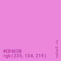 Цвет #EB86DB в цветовой модели RGB обозначается тремя октетами (235, 134, 219) в десятичном формате и #EB86DB в шестнадцатиричном (hex) формате, которые являются интенсивностью красного 235 (hex EB), интенсивность зелёного 134 (hex 86) и интенсивность синего 219 (hex DB).