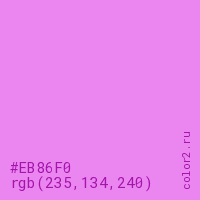 Цвет #EB86F0 в цветовой модели RGB обозначается тремя октетами (235, 134, 240) в десятичном формате и #EB86F0 в шестнадцатиричном (hex) формате, которые являются интенсивностью красного 235 (hex EB), интенсивность зелёного 134 (hex 86) и интенсивность синего 240 (hex F0).