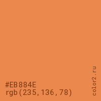 Цвет #EB884E в цветовой модели RGB обозначается тремя октетами (235, 136, 78) в десятичном формате и #EB884E в шестнадцатиричном (hex) формате, которые являются интенсивностью красного 235 (hex EB), интенсивность зелёного 136 (hex 88) и интенсивность синего 78 (hex 4E).