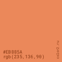 Цвет #EB885A в цветовой модели RGB обозначается тремя октетами (235, 136, 90) в десятичном формате и #EB885A в шестнадцатиричном (hex) формате, которые являются интенсивностью красного 235 (hex EB), интенсивность зелёного 136 (hex 88) и интенсивность синего 90 (hex 5A).
