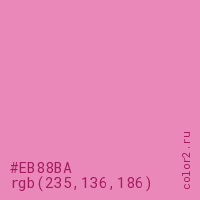 Цвет #EB88BA в цветовой модели RGB обозначается тремя октетами (235, 136, 186) в десятичном формате и #EB88BA в шестнадцатиричном (hex) формате, которые являются интенсивностью красного 235 (hex EB), интенсивность зелёного 136 (hex 88) и интенсивность синего 186 (hex BA).