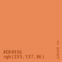 Цвет #EB8956 в цветовой модели RGB обозначается тремя октетами (235, 137, 86) в десятичном формате и #EB8956 в шестнадцатиричном (hex) формате, которые являются интенсивностью красного 235 (hex EB), интенсивность зелёного 137 (hex 89) и интенсивность синего 86 (hex 56).