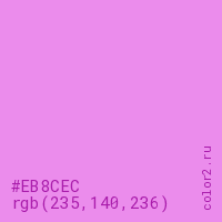 Цвет #EB8CEC в цветовой модели RGB обозначается тремя октетами (235, 140, 236) в десятичном формате и #EB8CEC в шестнадцатиричном (hex) формате, которые являются интенсивностью красного 235 (hex EB), интенсивность зелёного 140 (hex 8C) и интенсивность синего 236 (hex EC).