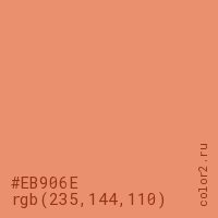 Цвет #EB906E в цветовой модели RGB обозначается тремя октетами (235, 144, 110) в десятичном формате и #EB906E в шестнадцатиричном (hex) формате, которые являются интенсивностью красного 235 (hex EB), интенсивность зелёного 144 (hex 90) и интенсивность синего 110 (hex 6E).