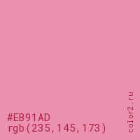 Цвет #EB91AD в цветовой модели RGB обозначается тремя октетами (235, 145, 173) в десятичном формате и #EB91AD в шестнадцатиричном (hex) формате, которые являются интенсивностью красного 235 (hex EB), интенсивность зелёного 145 (hex 91) и интенсивность синего 173 (hex AD).