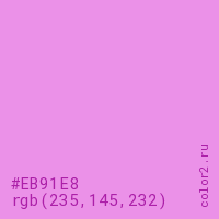 Цвет #EB91E8 в цветовой модели RGB обозначается тремя октетами (235, 145, 232) в десятичном формате и #EB91E8 в шестнадцатиричном (hex) формате, которые являются интенсивностью красного 235 (hex EB), интенсивность зелёного 145 (hex 91) и интенсивность синего 232 (hex E8).